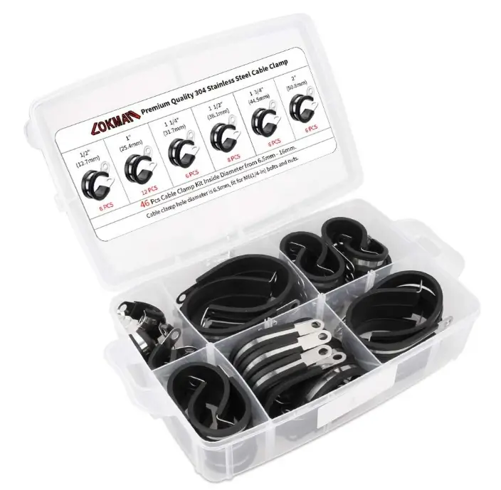 The LOKMAN 46-piece cable clamp assortment kit offers a durable and versatile solution for securing pipes, hoses, and cables of various sizes. Made from 304 stainless steel, these clamps provide excellent corrosion resistance for indoor and outdoor applications. The rubber-cushioned insulation helps reduce vibration, noise, and abrasion while protecting the surface of the pipe or cable. With six common sizes included, this kit allows you to quickly choose the right clamp for a secure and professional installation