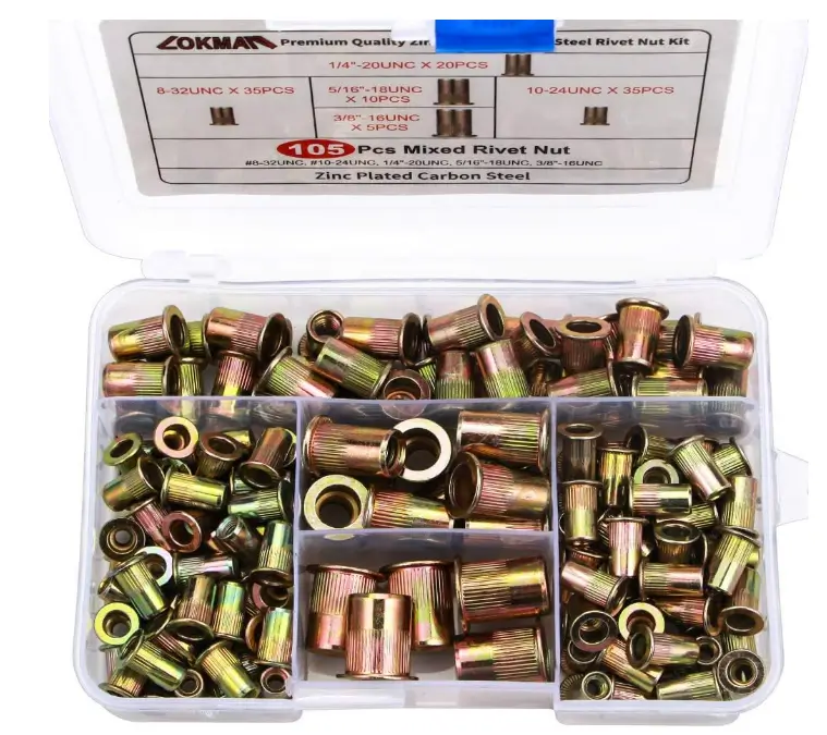 The LOKMAN 105PCS rivet nut assortment kit includes the most commonly used UNC sizes, making it ideal for automotive, fabrication, and mechanical projects. Made from durable carbon steel with a knurled body, these threaded inserts provide strong grip and reliable thread engagement in thin materials. The flat head design allows for a clean, flush finish once installed. With multiple sizes organized in one kit, it offers convenience, versatility, and dependable performance for professional and DIY use
