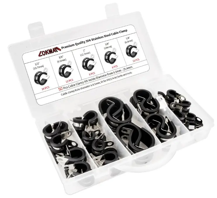 The LOKMAN 50-piece stainless steel cable clamp assortment kit offers a versatile solution for securing pipes, tubes, and wires in a wide range of applications. Each clamp features a rubber cushion that reduces vibration, protects cables from abrasion, and minimizes noise. Made from corrosion-resistant stainless steel, these clamps are suitable for both indoor and outdoor installations. With five common sizes included, this kit makes it easy to choose the right clamp for clean, secure, and professional results